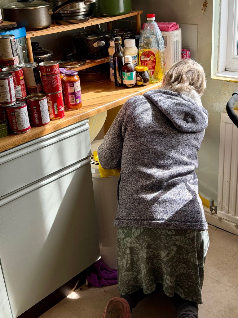 Today, I painted the cupboard doors and drawer fronts. Tomorrow, I’m painting the tiles the same colour. Then we’re replacing the tired mustard colour with pale green emulsion paint. Should be good.